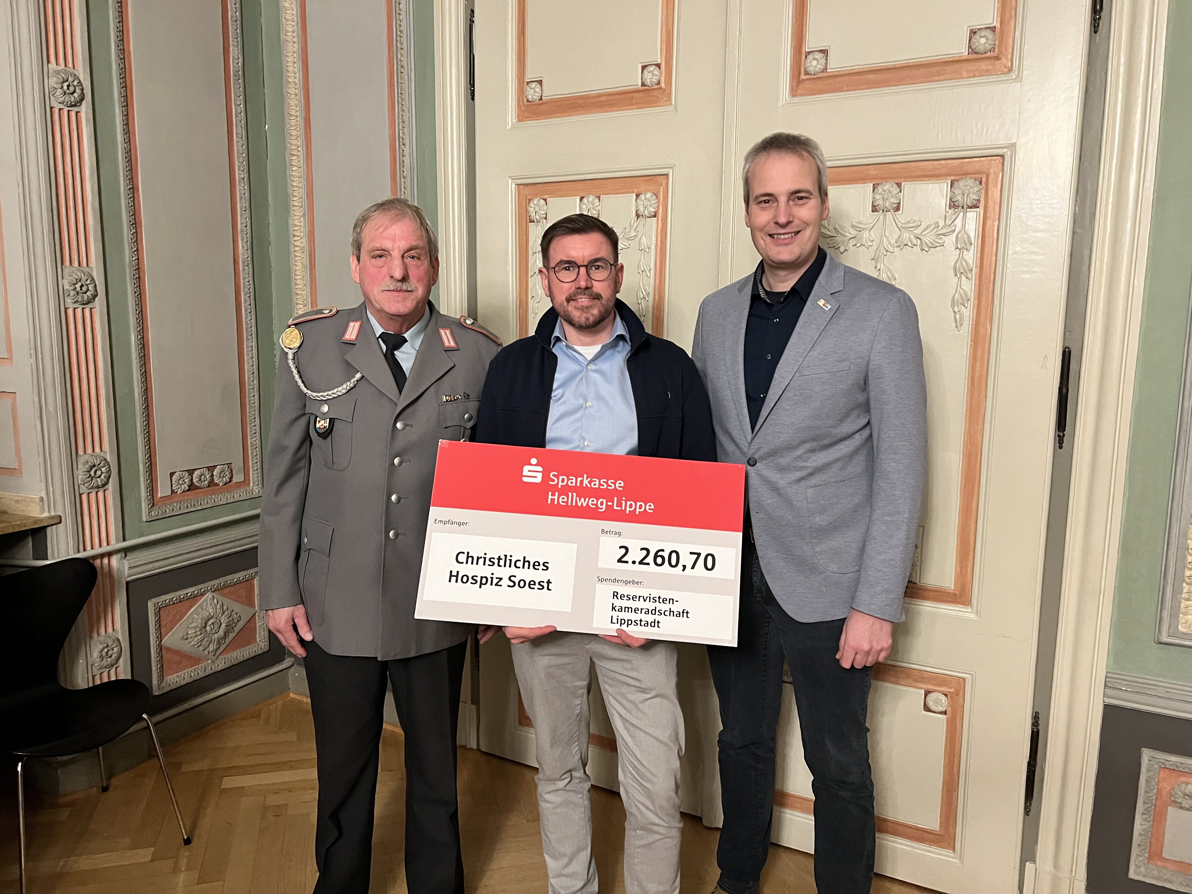 Aus den Händen von Eckhard Schulze-Dasbeck, dem Vorsitzenden der Reservistenkameradschaft Lippstadt e. V., erhielt Hospiz-Geschäftsführer Sebastian Thiemann einen Scheck über 2.260,70 € für das Bauprojekt.